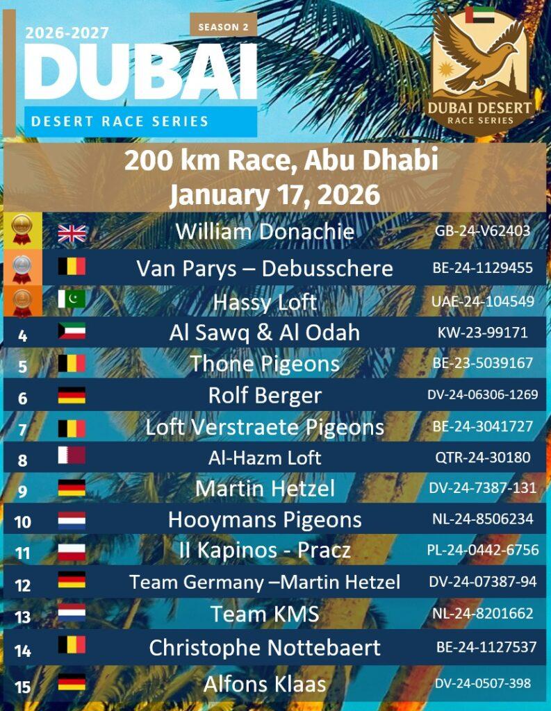 The remainder of the Top 10 is filled with pigeons from established international top lofts, once again proving the depth and quality of the Dubai Desert Race Series.
